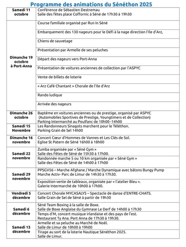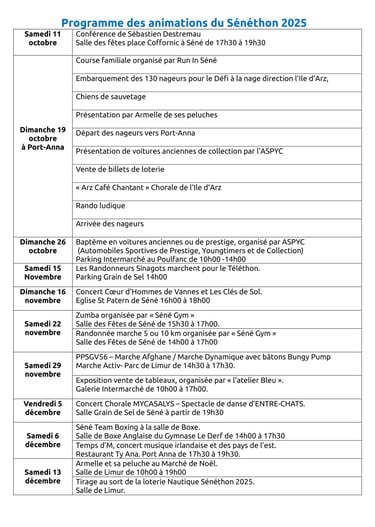 À l'occasion du 13ᵉ Sénéthon, de nombreuses animations vous sont proposées, voir ci-contre le programme. N'hésitez pas à participer aux différentes manifestations.