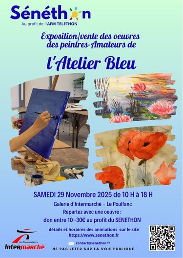 Le 14 décembre 2024, l'Atelier Bleu présentera les œuvres de peintres amateurs dans la galerie commerciale du Centre Commercial d'Intermarché le Poulfanc. Les tableaux seront disponibles à la vente au profit du SENETHON et de l'AFM-TELETHON.
