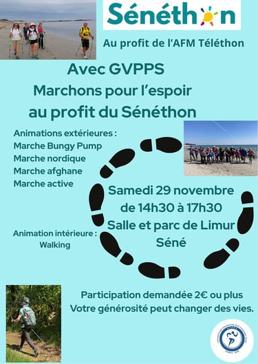 PPSGV56 vous invite à venir vous dépenser pour le SENETHON le samedi 30 novembre 2024, de 14h30 à 17h30, à la salle et au parc de Limur à Séné.