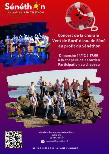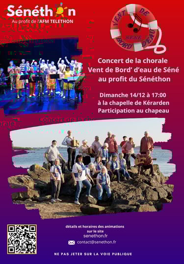 Le samedi 8 décembre 2024 à 16h00, les chorales KAN AVEL et MOSAÏK se produiront en concert à l'Église St Patern de Séné au profit du SENETHON. Sous la direction de Christophe GUILLEMIN et Agnès VINCENT, elles interpréteront un répertoire éclectique mêlant mélodies traditionnelles et musique sacrée.