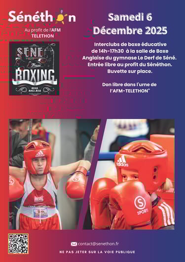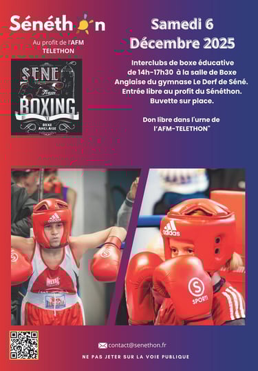 Le Séné Team Boxing organise en faveur du SENETHON le 30 novembre 2024, de 14h à 18h, au gymnase Le Derf, une rencontre rassemblant une cinquantaine de jeunes boxeurs de 6 à 16 ans dans un esprit de fair-play.