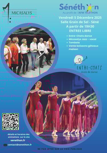 Vendredi 5 décembre, la chorale Micasalys et l’école de danse Entrechats organisent un spectacle à la salle Grain de Sel de Séné, à partir de 19h30. Entrée libre, dons au profit du Sénéthon.